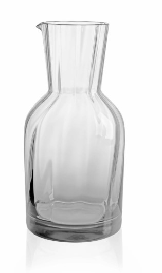 Karafa na vodu Yra s jemně zvlněným povrchem, inspirovaným pohybem vody i tradičními sklářskými vzory. Elegantní silueta s plastickým reliéfem podtrhuje ruční zpracování a dodává nápojům vizuální i hmatový rozměr.