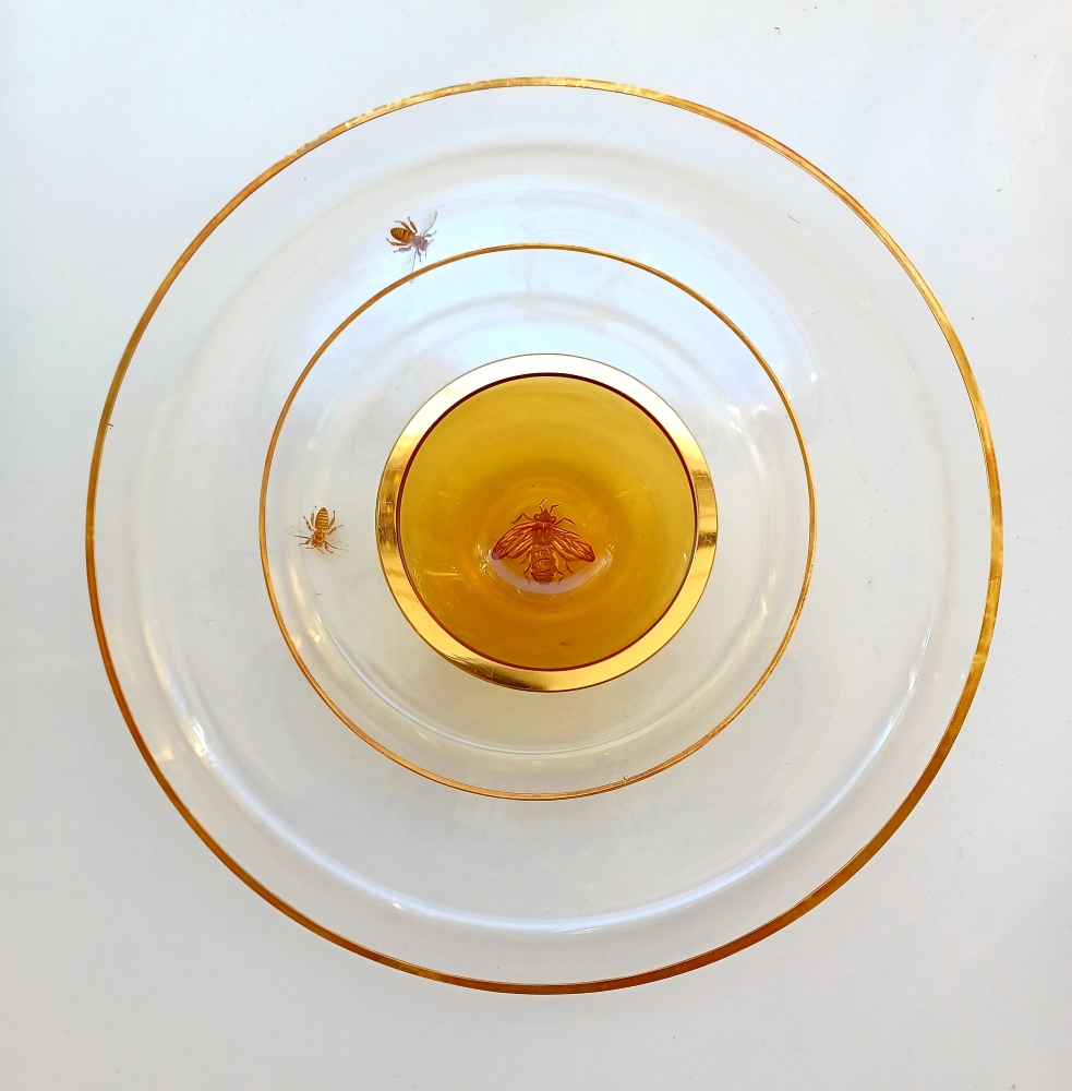 Přišlo jaro a teplo vábí včely na našich zahradách k vylétnutí z úlů, aby se rozhlédly po dlouhé zimě, jak je na světě. Jestli už kvetou medonosné rostliny a jestli se již mohou dát do té jejich usilovné práce. I v našem obchodě „ poletují “ včelky. Máme dokonce několik druhů. Včelky jsou buď malované nebo vyryté do stěn sklenek nebo dokonce zlacené 24 karátovým zlatem. Můžete je nalézt v kolekci Let it Bee na krásných miskách o průměru 7,5 cm, určených pro odkládání prstýnků a jiných drobností, vše od autorky Barbory Otradovec. Dále pak ve třech velikostech sklenek na martini, kde jsou včelky ryté i zlacené. Také z této kolekce na sklenkách Club 300 v křišťálu nebo s lazurou v barvě medu, o obsahu 300 ml, najdete zlacené včely na dnech a stěnách. Ze stejné kolekce jsou i tenkostěnné talířky, které se honosí dekorem včel ručně malovaných. To vše povyšuje sklo na luxusní celek, který Vám na jaře udělá radost.