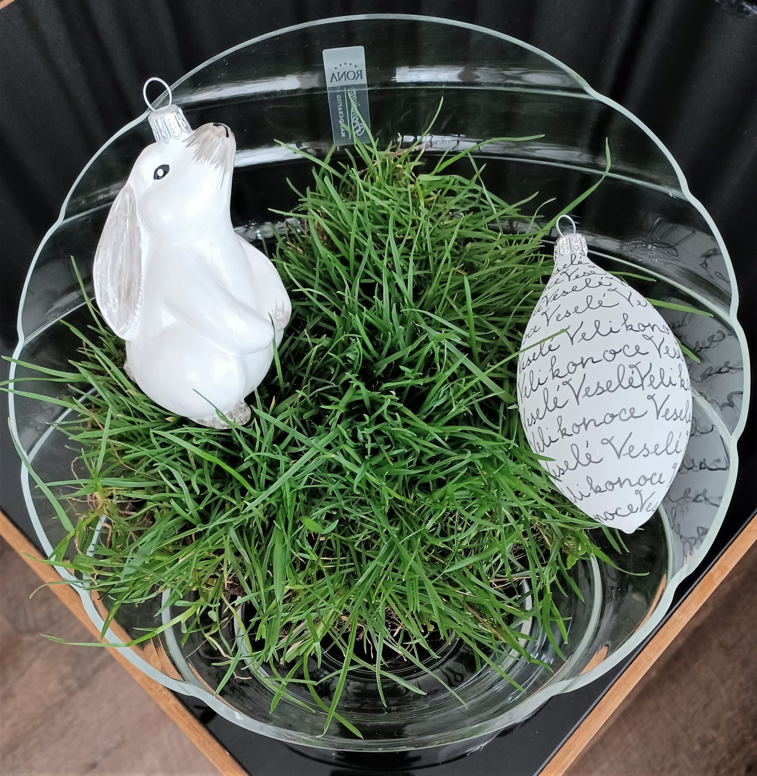 Naši zajíčci jsou z foukaného skla, ručně malovaní a to buď ve formě závěsu nebo jako zápich do osení. K tomu sada vajíček, co nám „snesl“ zajíček, s přáním veselých Velikonoc.